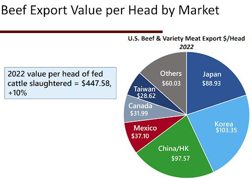 That is why a portion of your Beef Checkoff dollars are invested into maintaining and developing international relationships via the U.S. Meat Export Federation (USMEF), a contractor to the Beef Checkoff. International trade relationships return value to your operation. According to USMEF, in 2022 value per head of fed slaughtered totaled more than $440 dollars.