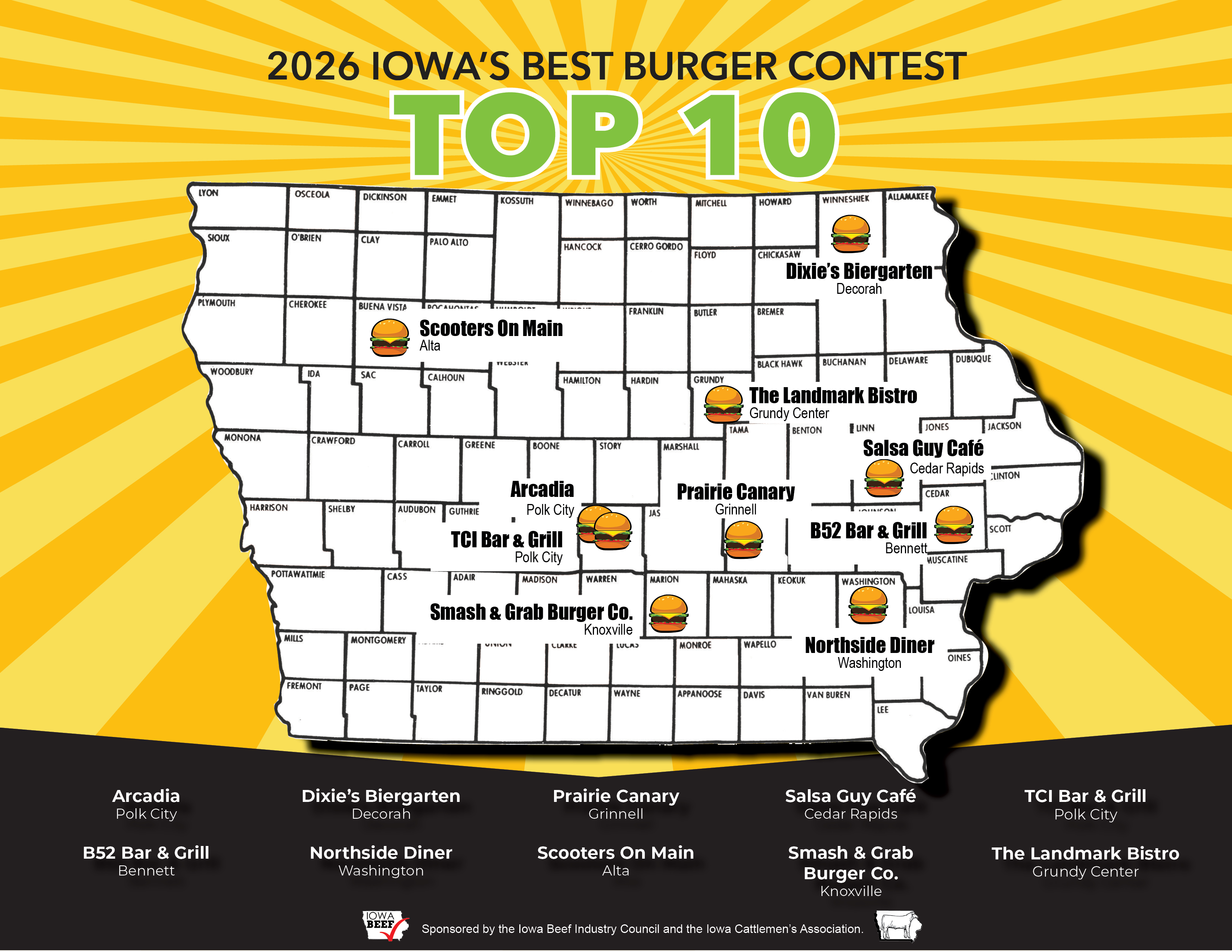 On the square in Pleasantville, Iowa, family, community, and Iowa’s best burger intersect at Halftime Bar & Grill. The Iowa Beef Industry Council and Iowa Cattlemen’s Association are proud to name Halftime Bar & Grill—and its owners, the DeHeer family—the home of Iowa’s Best Burger for 2025.