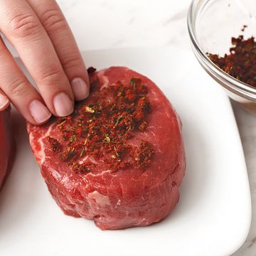 Combine rub ingredients; press evenly onto beef steaks.