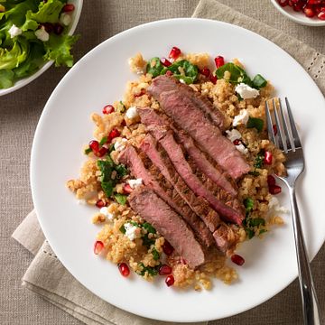 Carve steaks into slices; season with salt, as desired. Place quinoa on serving platter; top with cheese. Arrange beef around quinoa. Garnish with pomegranate arils, if desired.