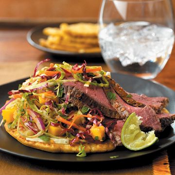 A fresh marinade gives Flank Steak flavorful tenderness before it's sliced to serve atop papusas with a crunchy slaw with tropical fruit.