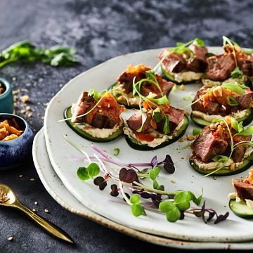 Slices of cucumber are topped with beef Strip Steak, herbed cream cheese and a spicy Asian Sauce. This Beef. It's What's For Dinner. recipe is certified by the American Heart Association®.