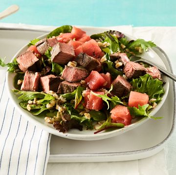 Nutrition information per serving, 3 oz beef, 1/2 cup watermelon, 2 tablespoons vinaigrette, 1/4 cup farro: 419 Calories; 119.7 Calories from fat; 13.3g Total Fat (2.6 g Saturated Fat; 0.2 g Trans Fat; 0.3 g Polyunsaturated Fat; 1.7 g Monounsaturated Fat;) 56 mg Cholesterol; 635 mg Sodium; 47.6 g Total Carbohydrate; 4.4 g Dietary Fiber; 29.7 g Protein; 0 mg Calcium; 3 mg Iron; 667 mg Potassium; 0.2 mg Riboflavin; 6.9 mg NE Niacin; 0.6 mg Vitamin B6; 1.2 mcg Vitamin B12; 218 mg Phosphorus; 4.3 mg Zinc; 26.3 mcg Selenium; 94.1 mg Choline.