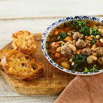 Enjoy this hearty Tuscan-style Ground Beef meatball soup chock-full of vegetables, beans and grains.