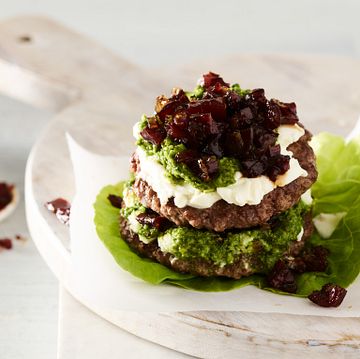 Place patties on 4 lettuce leaves to form a cup, top with 1 tablespoon cheese, 1 tablespoon Spinach-Lemon Pesto, 1 tablespoon Beef Jerky Marmalade, another patty, 1 tablespoon cheese, 1 tablespoon Spinach-Lemon Pesto and 1 tablespoon Beef Jerky Marmalade. Garnish each stack with balsamic syrup, as desired.