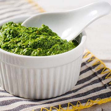Try this recipe. Spinach pesto with Parmesan cheese, almonds, and lemon. Perfect to top a steak or burger.