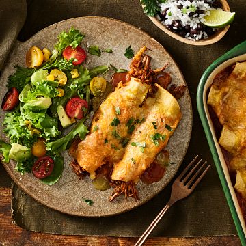 Tender, seasoned braised beef inside tortillas and smothered with enchilada sauce and topped with cheese. Perfect for the holidays or any time of year.