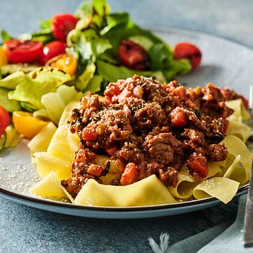 Ground Beef, vegetables and tomato sauce slow simmered and served over pasta.