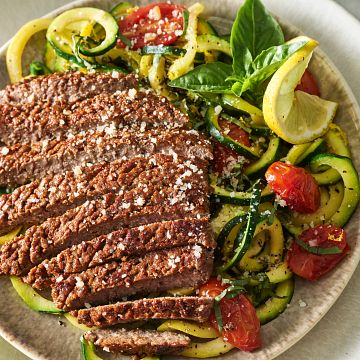 Nutrition information per serving, 1 steak with zoodles: 264 Calories; 88.2 Calories from fat; 9.8g Total Fat (2.7 g Saturated Fat; 0 g Trans Fat; 0.5 g Polyunsaturated Fat; 1.1 g Monounsaturated Fat;) 72 mg Cholesterol; 583 mg Sodium; 14.7 g Total Carbohydrate; 3.1 g Dietary Fiber; 8.9 g Total Sugars; 28.7 g Protein; 0 g Added Sugars; 81.5 mg Calcium; 4 mg Iron; 761 mg Potassium; 0 mcg Vitamin D; 0.2 mg Riboflavin; 5.4 mg NE Niacin; 0.3 mg Vitamin B6; 1.7 mcg Vitamin B12; 178 mg Phosphorus; 4.9 mg Zinc; 32.1 mcg Selenium; 107 mg Choline.