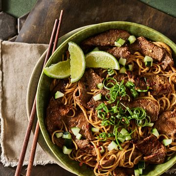 Thin strips of Top Round Steak are quickly cooked in teriyaki sauce before joining thin spaghetti noodles and cucumbers in a flavorful peanut butter sauce.